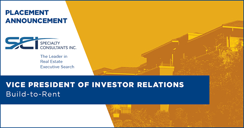 SCI is pleased to announce the successful placement of a Vice President of Investor Relations with an innovative and rapidly growing firm in the build-to-rent sector.